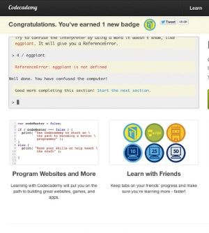 Codecademy 在首页提供了可交互的命令行界面作为引导。用户输入代码后会得到即时的反馈,如果成功完成了小教学任务,还可以得到徽章作为奖励。你完全不需要注册就可以享受到交互式的体验,甚至还能得到徽章,这种感觉很棒,让我很乐于为他们的转化率提升做一点小小的贡献。