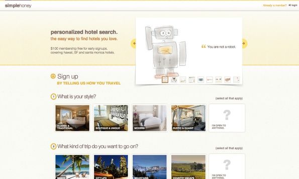以旅游网站 simplehoney 为例。这种类型的站点中,比较传统的做法是让用户通过各种复杂的搜索表单来计划行程安排,而 simplehoney 则向用户提供了一系列与搜索目标相关的图片或启发性关键词,引导他们更加轻松和直观的完成计划流程中的各项任务,例如选择酒店以及期望中的出游类型等。