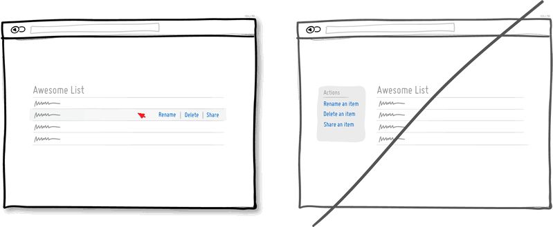 有时,可以让某些特定的界面元素具有交互性,来触发显示相关的任务选项,而不是直接提供一系列关联性不强的动作列表。例如,当呈现一个数据列表时,我们通常需要允许用户对每条数据进行操作。你可以让用户通过鼠标悬停使每个列表单元中的相关操作呈现出来 (删除、重命名等等)。另外一个关于直接操作的常见案例就是点击数据条目本身 (譬如一段地址信息),使其进入编辑状态。相比于无视上下文情境而直接展示各种操作选项,这种交互模式可以让用户更加聚焦于当前的目标,减少界面复杂性和操作步骤。但要记住,对于一些较为常规的、情境化确实不强的普通操作来说,情境菜单仍有它的用处。
