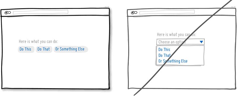 你每使用一个下拉菜单,就会隐藏掉一些行为选项,用户就会需要多付出些力气来找到它们。如果那些隐藏掉的选项是要被放置在用户浏览内容、完成决策的主要路径上的,那么你也许应该考虑一下将它们一览无余的呈现出来。而对于那些可以预计的、无需学习成本的操作,例如选择日期和时间,或地理位置设置等,仍可以保持下拉菜单的形式。有时,下拉菜单也可以适用于那些需要用户反复执行相同动作的界面;但如果某些操作是保证转化率提升的主要 Call to Action,在考虑下拉菜单的时候还是小心为妙。
