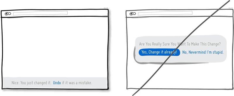 设想一下,你刚刚点击了一个按钮或链接。撤销功能尊重人类的基本意图,允许首先平滑的产生相应的行为。而另一方面,弹出确认的形式会质疑用户的意图,致使用户对自己要做的事情产生疑虑。我愿意假设,多数时候,用户的行为都符合自己的意图,误操作只是少数情况。当用户需要反复执行某个行为的时候,低效、丑陋的弹出确认就会一遍一遍的呈现,非常不人性化。尝试通过撤销功能让用户感觉自己正在充分控制局面,尽量不要通过确认来提出质疑。