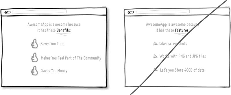 以目标为导向,人们更关注产品能给他们带来怎样的好处,而不是产品具有哪些功能。“好处”可以更加清晰的定义产品的价值。Chris Guillebeau 在 "The $100 Startup”当中写道,人们非常关注于拥有更多的爱、金钱、认同、能自由分配的时间;同时希望有更少的压力、矛盾、麻烦与不确定性。当你向用户介绍产品时,我相信总会有一定的空间来向他们展示产品所带来的好处,能帮他们解决的问题,等等。