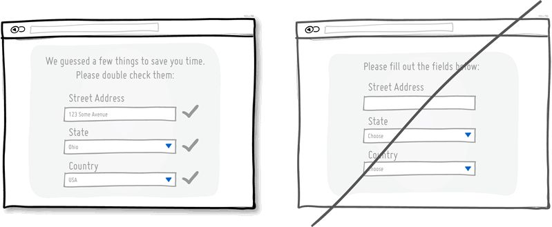 在表单字段中预先填写合理的默认值,这是一种帮助用户尽快完成表单填写的常见方式。最差劲的体验之一,就是用户曾经填写过某些数据,而你还要他们重复这些动作。使用经过调研验证的恰当数据,或是曾经保存过的用户输入内容作为表单字段的默认值,让用户少做些事情,多些轻松。