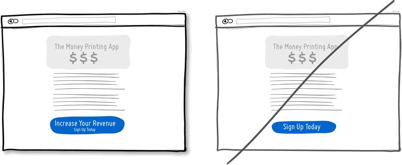 想象一个页面中的两个按钮。一个写着“帮你省钱”,一个要你“注册”。我打赌点击第一个按钮的人会更多,因为一个孤零零的“注册”难以展示产品的内在价值。或者,展示好处的内容也可以放在距离 Call to Action 很近的地方,以便让用户知道为什么要去点击按钮。当然,不是所有的按钮都需要展示这样的文案;那些任务驱动的“普通”按钮更适于对转化率没有什么要求的环节当中,或是需要用户反复执行的操作上。