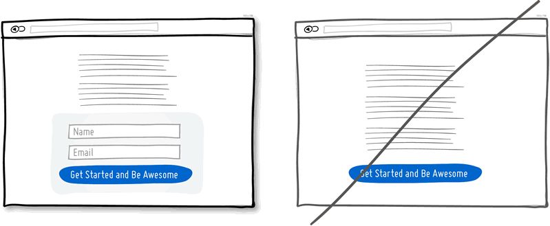 直接将注册表单呈现在 landing 页面当中可以带来诸多好处。首先,我们可以从流程当中节省出一步,减少一个多余的页面,让用户更省时。第二,直接将各表单字段呈现在这里,用户就能对注册流程的长度有一个明确的认知。这种做法的前提是你的表单确实足够短;当然,你的表单也应该足够短,这应该是你的设计目标之一。