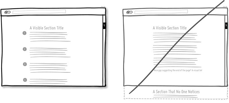 “内容结束”的假象是转化率的杀手。特别是在长页面中那些段落分隔的地方,当心不要让用户觉得内容已经结束掉了。试着确定一种视觉模式与节奏,让用户可以得到明确的指引,持续阅读内容。对于有可能出现在“折现”位置的留白或内容间距,要确保它们的尺寸不会过大。