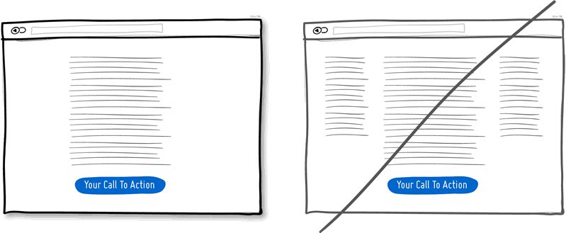 这种方式特别适合于单栏布局的长页面,或者也可以让 Call to Action 在多个页面中多次出现。你自然不想在一个页面中一口气展示 10 个同样的 Call to Action,然而如今长页面越来越普遍,让所有内容都保持在“折线以上”的原则越来越不受用。你可以试着在第一屏当中放置一个不那么强的 Call to Action,然后将作用相同但视觉形式更突出的 Call to Action 放置在内容底部。当人们看过所有内容后,他们会停下来,思考一下接下来做些什么——就在这里,完成转化或关闭交易。