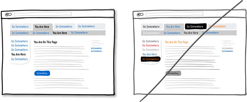 例如配色、层次、对比等视觉风格要素可以帮助人们更好的理解和使用你的产品界面,让他们知道自己现在在哪,接下来可以去哪。为了清晰的呈现这些信息,可点击元素 (链接、按钮) 以及可选择项目 (选项)、普通文字内容的视觉风格必须彼此形成显著的差异,并且在全局范围内保持风格的一致性。在下面的草图范例中,我使用蓝色来表示可点击元素,黑色文字表示已选择或当前所在位置标题。如果你能正确的使用视觉风格,用户将能更好的通过这些视觉线索浏览界面。绝不要让这几类视觉元素的呈现方式含糊不清,否则你就是在给用户找麻烦。
