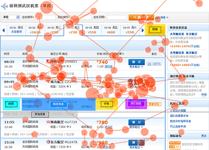 相比之下,眼动更适合解答传统可用性测试中无法解释的具体疑问。(比如在确认在线支付前,用户在这个页面上纠结什么)倘若后台数据显示某些链接的点击率和页面跳出率很高,眼动可以告诉你用户真正在找什么。
