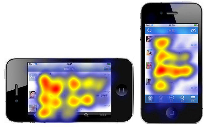 如上图中从一款 App 横、竖版的眼动热区图分布来看,横版设计中红色的区域较多,用户似乎更青睐横版。