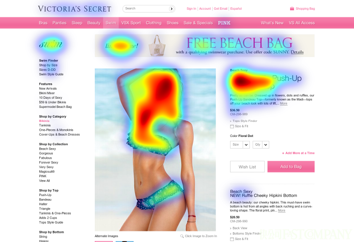 免費東西人人愛,對嗎?但人們似乎沒有我們想像中那麼受到「免費」兩字的吸引。當受試者瀏覽寫有「免費贈品」或「免運費」等字眼的網頁時,反而大多專注在閱讀產品資訊,又或是特定案例顯示的:都在盯著維多利亞的秘密(Victoria'sSecret)的內衣模特兒看。