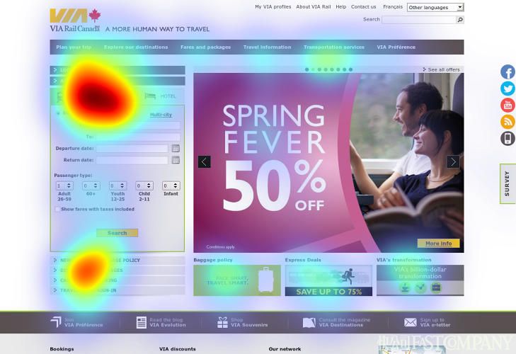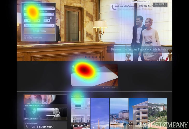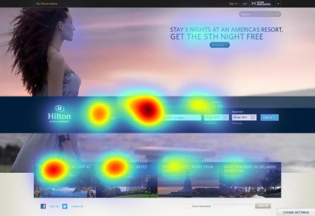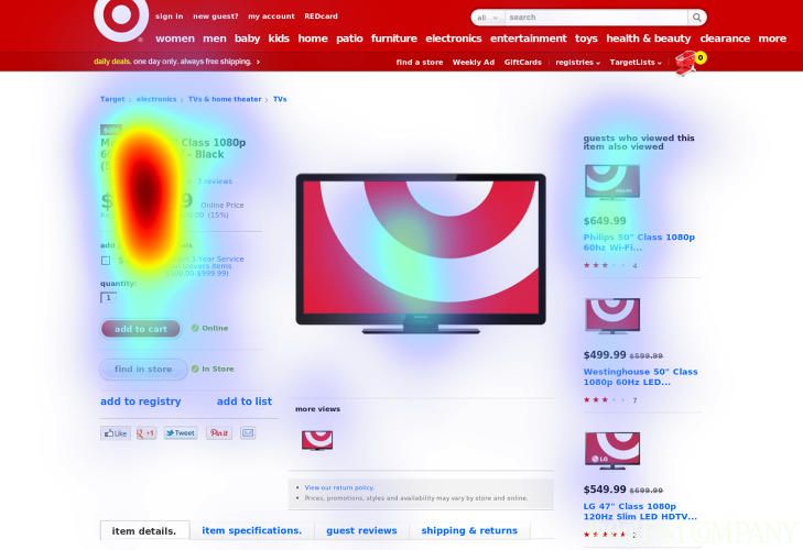 這項實驗請來 46 位受試者協助 EyeQuant 公司改良關於網站吸睛元素的預測運算系統。受試者們前往德國奧斯納布呂克大學(University ofOsnabrueck)的神經科學實驗室,他們的購買意向包括最新 Levi's 牛仔褲、由塔吉特(Target)百貨商場出售的電視機或巴黎週末遊等 200 項產品。在瀏覽了這些產品的相應網頁後,由實驗人員利用熱地圖(heatmaps)呈現出最為吸睛的元素,而「吸睛」平均時間為 20 秒。以下是研究人員的發現: