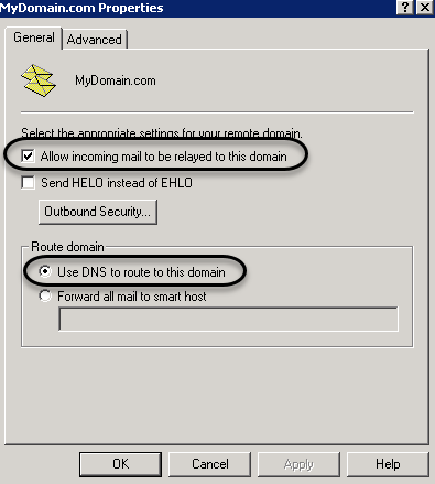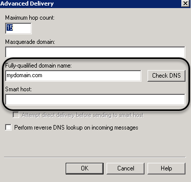 - 使用高级选项指定在 SMTP 服务器中创建的域。将智能主机留空。