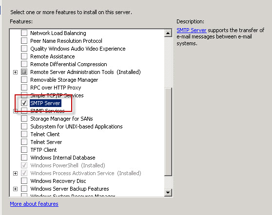 SMTP 服务器功能的安装是通过服务器管理选项完成的: