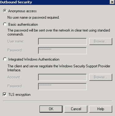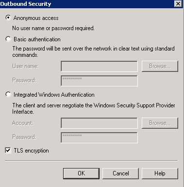 - 在传送设置下,指定具有匿名访问和 TLS 加密的出站安全选项: