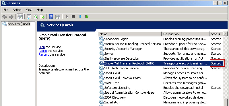 安装此功能后,请确保 SMTP 服务正在运行,并设置为以自动模式启动: